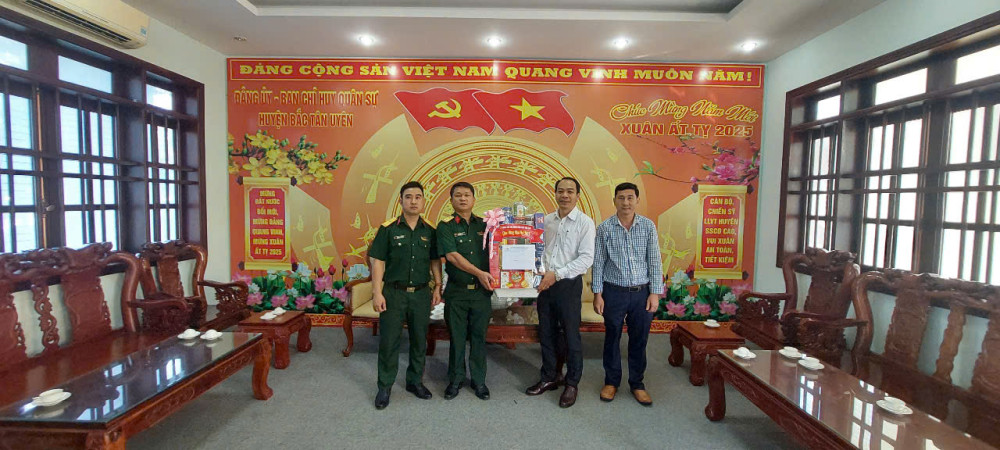 [Ảnh 6: Ông Nguyễn Văn Chung – Phó Giám đốc Trung tâm cùng đoàn công tác chúc Tết ban chỉ huy quân sự huyện Bắc Tân Uyên]