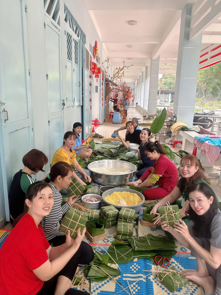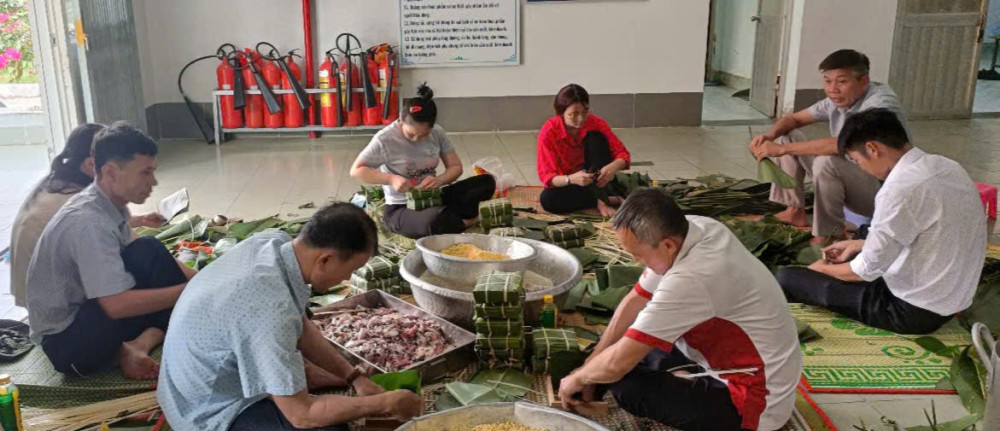[Các tổ công đoàn đang tất bật gói bánh chưng. Không khí rộn ràng, ấm cúng tràn ngập khắp khu vực]