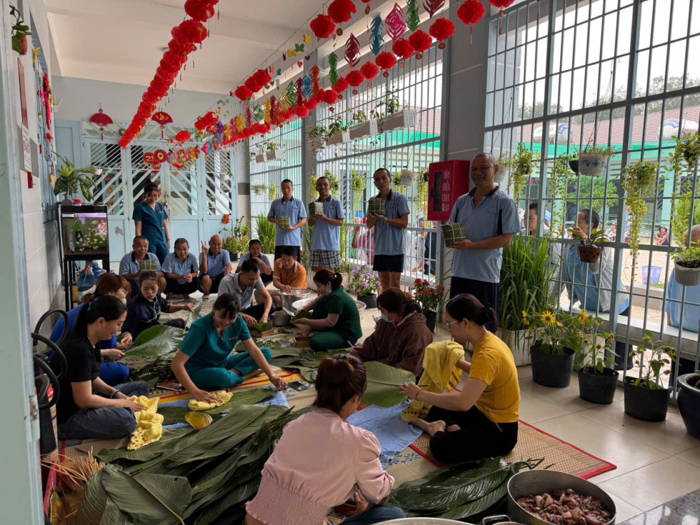 TÂN ĐỊNH, NGÀY 24 THÁP CHẠP GIÁP THÌN - Trong cái se lạnh của những ngày cuối năm, không khí tại Trung tâm Điều dưỡng tâm thần Tân Định bỗng trở nên ấm áp lạ thường. Hôm nay, nơi đây không chỉ có những hoạt động chăm sóc thường nhật, mà còn rộn ràng tiếng cười nói, tiếng lá dong xào xạc, tiếng gạo nếp rơi – tất cả hòa quyện trong Hội thi gói bánh chưng với chủ đề “Chia sẻ yêu thương, nhân niềm hạnh phúc”.