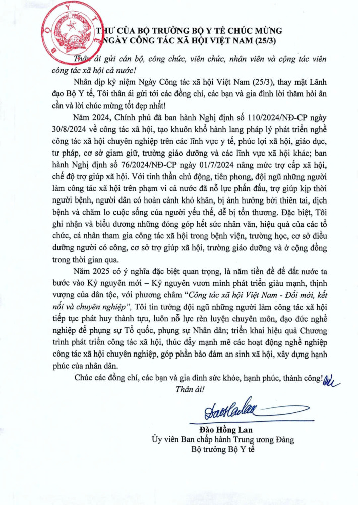 Thư của Bộ Trưởng Bộ Y tế chúc mừng Ngày Công tác xã hội Việt Nam 25/3