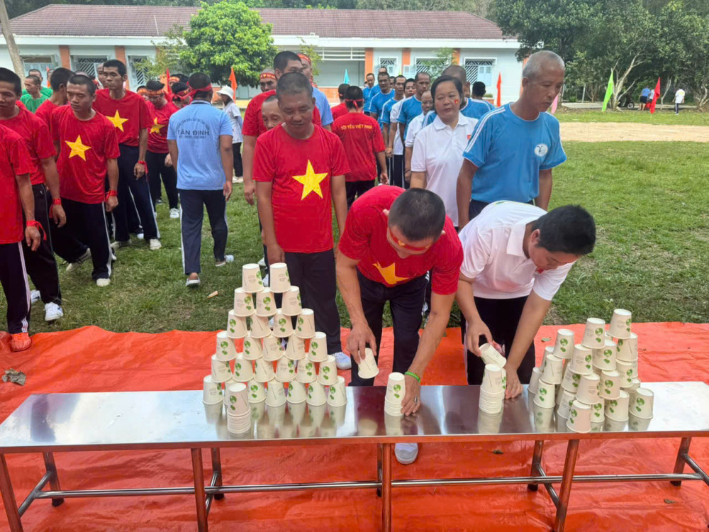 Sau phần thi đồng diễn thể dục tay không, từng đội đã cùng chụp ảnh lưu niệm với Ban Giám đốc Trung tâm và đại diện lãnh đạo các bộ phận, ghi lại những khoảnh khắc đẹp và đáng nhớ. Không khí lễ hội tiếp tục được nối dài với chuỗi các trò chơi dân gian vui nhộn như xếp tháp ly bằng ly giấy, kẹp bóng, chèo thuyền trên cạn... Tiếng cười nói, reo hò cổ vũ đã tạo nên một khung cảnh ấm áp, xóa nhòa đi những ưu phiền, bệnh tật.