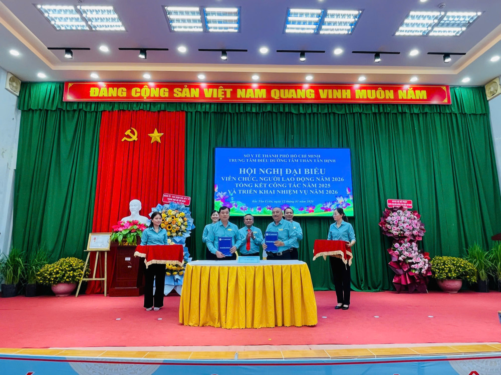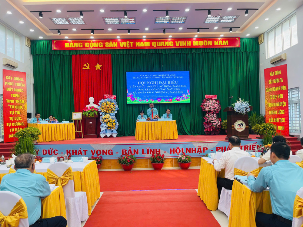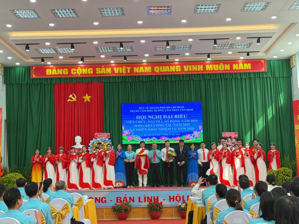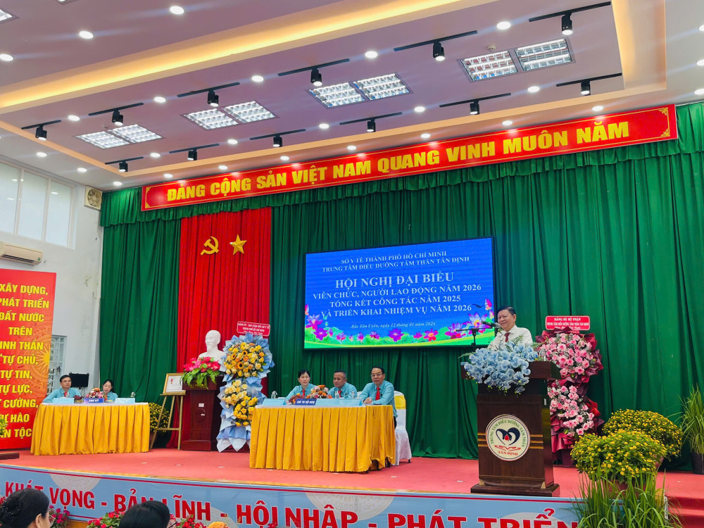 Trong không khí rộn ràng của những ngày đầu năm mới 2026, ngày 12/01/2026, Trung tâm Điều dưỡng tâm thần Tân Định đã trang trọng tổ chức Hội nghị Viên chức, người lao động năm 2026, tổng kết công tác năm 2025 và triển khai nhiệm vụ năm 2026. Đây không chỉ là dịp để nhìn lại một năm 2025 đầy nỗ lực, mà còn là cột mốc quan trọng để tập thể đơn vị cùng chung sức, đồng lòng vạch ra những giải pháp mới cho năm 2026 trong công tác chăm sóc bệnh nhân và thực hiện nhiệm vụ của Trung tâm.